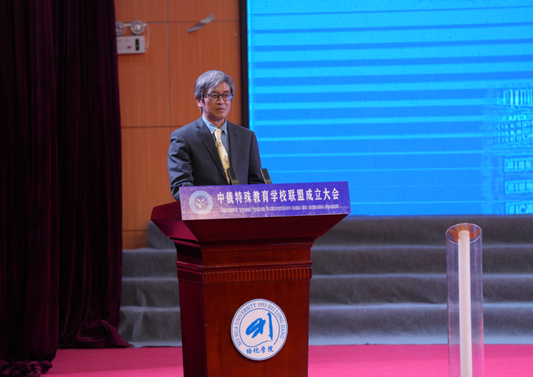 黨委書記劉峰代表綏化學(xué)院全體師生向出席大會的領(lǐng)導(dǎo)、嘉賓及關(guān)心支持學(xué)校發(fā)展的各界同仁表示歡迎與感謝。他指出,“中俄特殊教育學(xué)校聯(lián)盟”成立,開啟了特殊教育國際交流的嶄新篇章,這既是深入貫徹落實習(xí)近平總書記在新時代推動?xùn)|北全面振興座談會上的重要講話精神,也是落實打造向北開放新高地的務(wù)實之舉,更是踐行教育公平理念、彰顯人文關(guān)懷的生動實踐。期待與各成員單位一道,聚焦特殊教育師資聯(lián)合培養(yǎng)、融合教育模式創(chuàng)新、康復(fù)教育技術(shù)應(yīng)用、教學(xué)資源共享等重點方向,開展多層次、寬領(lǐng)域的深度合作。通過聯(lián)合教研、學(xué)術(shù)研討、人才互訪等形式,讓先進(jìn)理念落地生根,讓優(yōu)質(zhì)資源惠及更多特殊需要群體,努力將聯(lián)盟打造成為國內(nèi)一流、輻射中俄的特殊教育合作平臺。