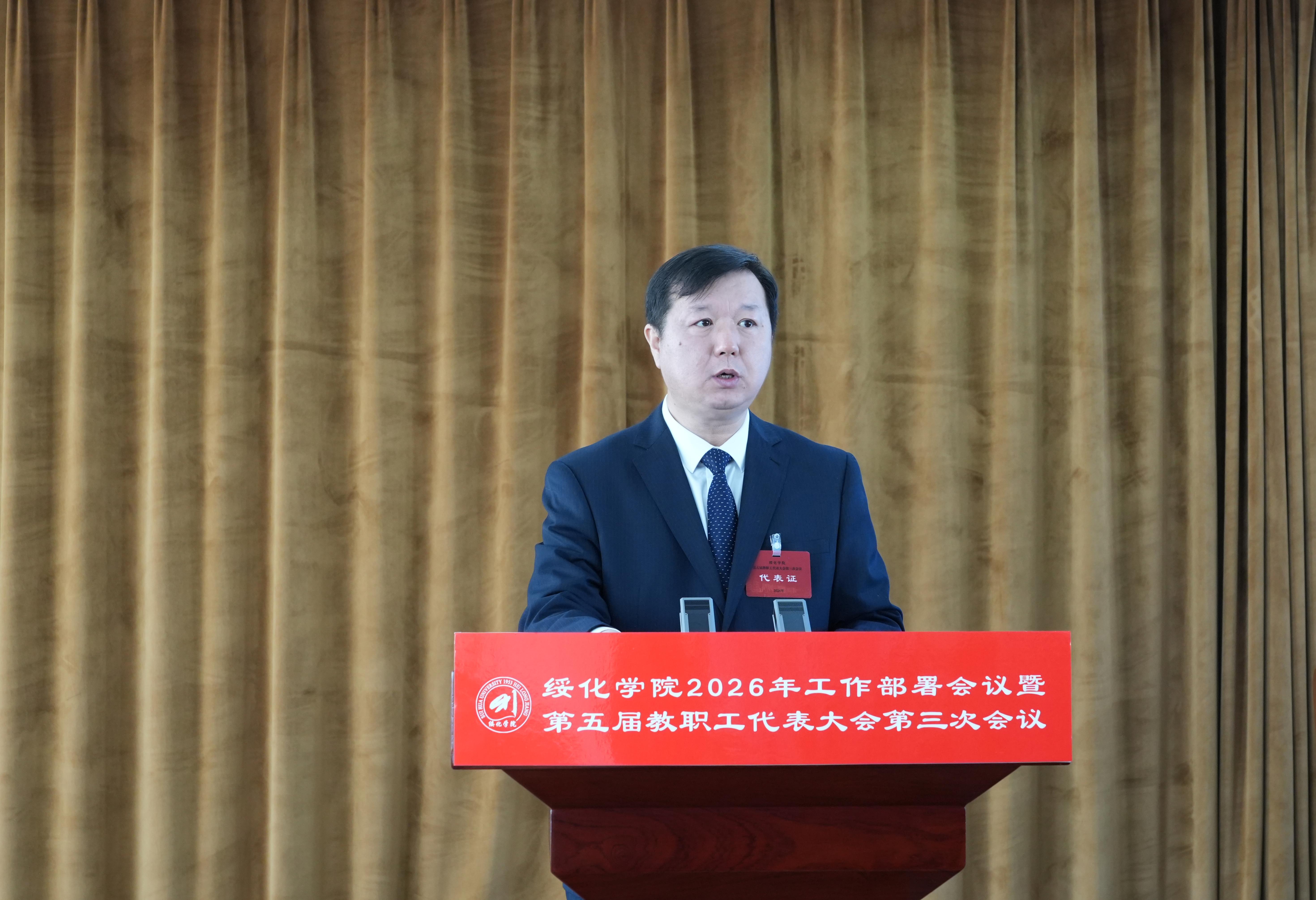 2月26日下午,學校2026年工作部署會議暨第五屆教職工代表大會第三次會議在厚德樓A502會議室召開。黨委書記劉峰出席會議并講話,院長李奇楠作工作報告并部署2026年工作,校領導姜軍、馬春華、鄭方明、孫永剛、劉鵬程出席會議,黨委副書記盧百勝主持會議。