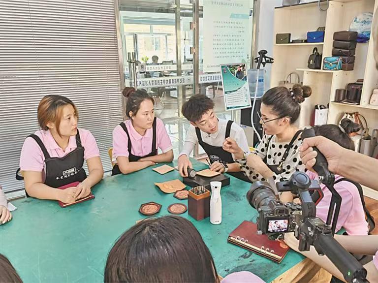 “孟繁一第一次把親手做的錢包送給媽媽時,她媽媽反復問‘這真的是你做的嗎?’孩子用手語回答‘是我做的’,她媽媽的眼眶頓時紅了?!闭劶皩W生們的成長,張麗的聲音里滿是感動。剛進工作室時,孟繁一因聽力障礙格外內向,溝通全靠紙筆,做壞了作品就躲在角落里偷偷抹眼淚?!奥犝蠈W生的手語只有1000個常用詞匯,要把‘皮革的柔軟度’‘色彩的層次感’這些抽象概念講清楚,得靠手把手演示,反復練習。”張麗說,為了鼓勵學生,她和團隊老師從不吝嗇夸獎,“你這次的針腳比上次整齊多了”“這個花紋設計很有想法”,還會引導學生先給家人設計作品,想著用親情的認可,幫他們建立信心。